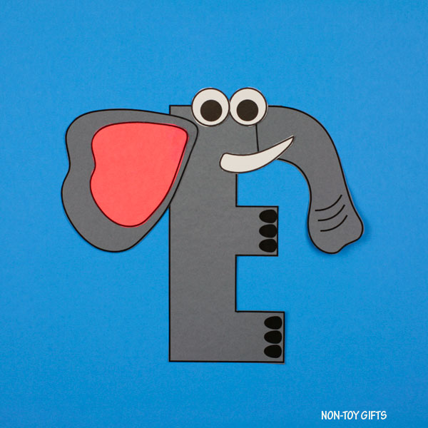 Kids will cut and glue pieces together to build the uppercase letter E hat looks like an elephant.